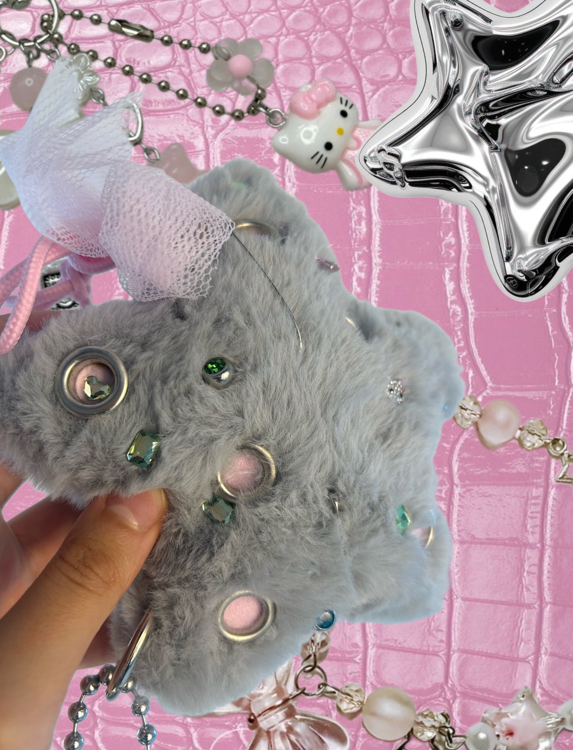 Fluffy grey keychain with piercingsย